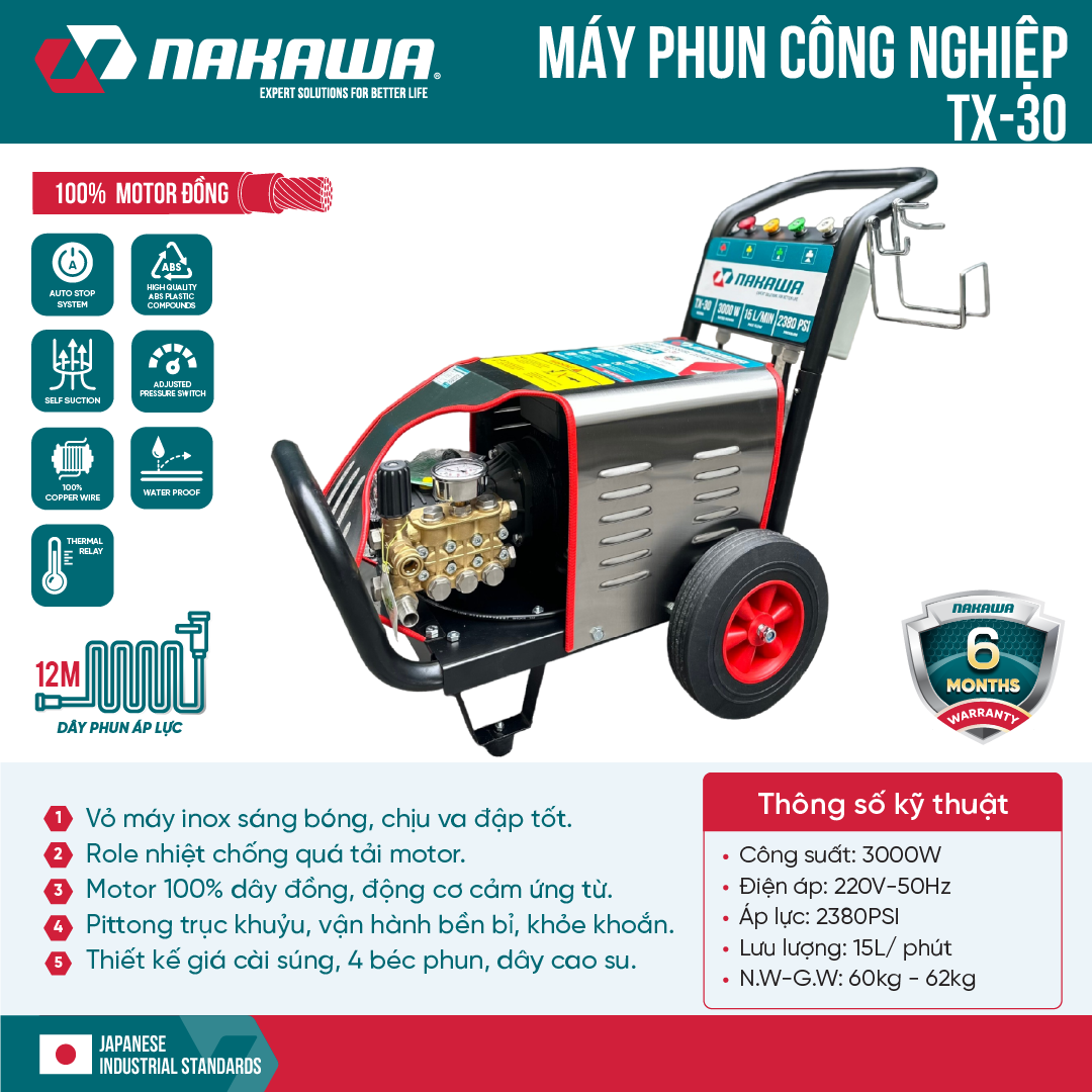 Máy phun áp lực cao công nghiệp Nakawa TX-30 với công suất lên đến 3000W, áp lực tối đa là 2380PSI, máy có thể dễ dàng đánh bay mọi vết bẩn, vệ sinh xe máy, ô tô, hồ bơi, làm sạch sân vườn, các thiệt bị máy móc,… một cách nhanh chóng, giúp người dùng tiết kiệm công sức và thời gian hiệu quả.