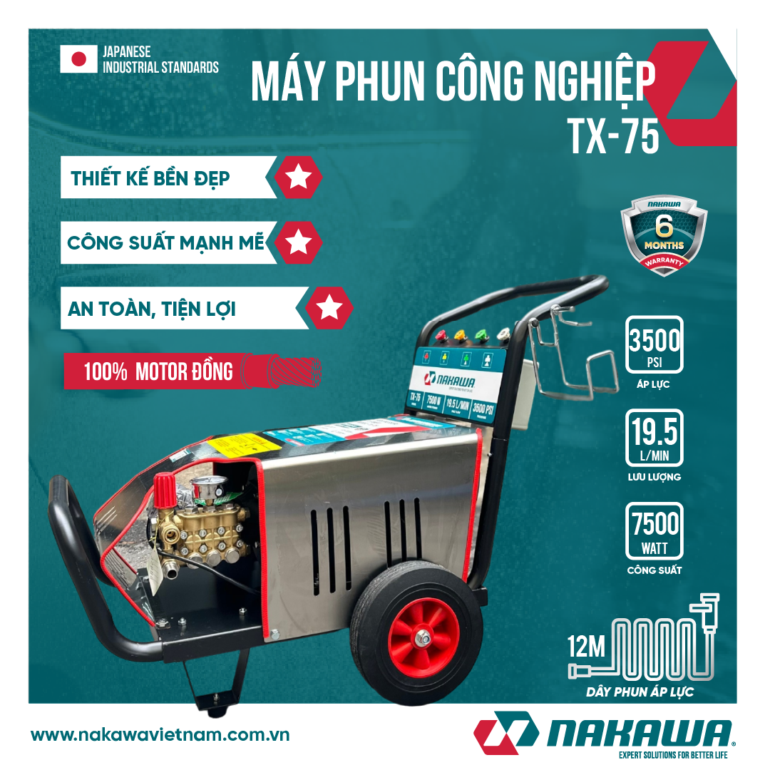 Máy phun áp lực cao công nghiệp Nakawa TX-75 với công suất lên đến 7500W, áp lực tối đa là 3500PSI, máy có thể dễ dàng đánh bay mọi vết bẩn, vệ sinh xe máy, ô tô, hồ bơi, làm sạch sân vườn, các thiệt bị máy móc,… một cách nhanh chóng, giúp người dùng tiết kiệm công sức và thời gian hiệu quả.